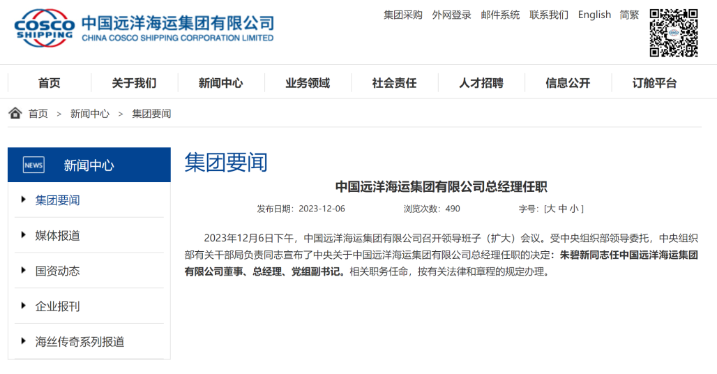 朱碧新任中国远洋海运集团有限公司总经理