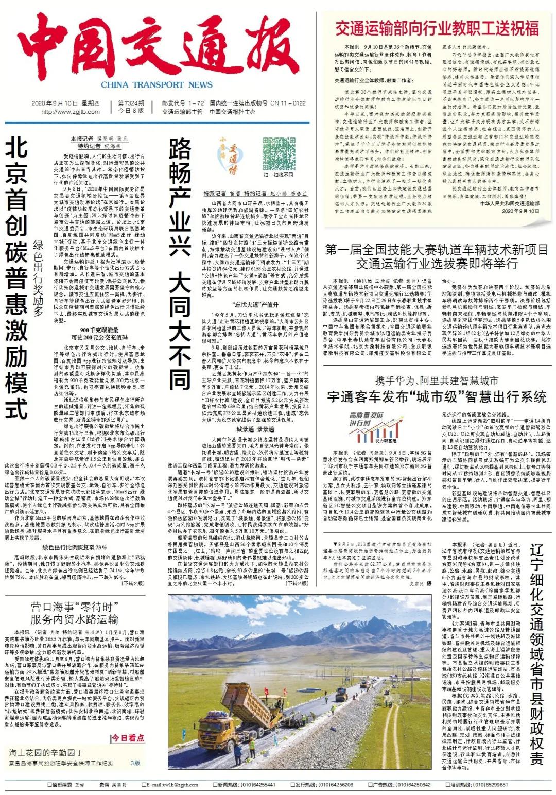 编委读报丨交通运输部向行业教职工送祝福;今日大同大不同;北京首创碳普惠奖励绿色出行……