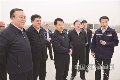 图为杨传堂(前排中)在长深高速公路康平海州窝堡乡至北四家子乡建设工地了解施工进展。 4月18日…