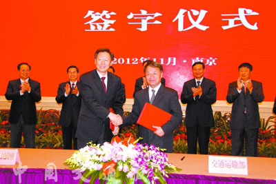 图为备忘录签字仪式现场。11月24日,交通运输部部长杨传堂在南京与江苏省委书记、省人大常委会主任…