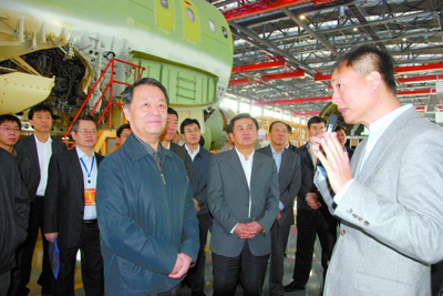 图为杨传堂、冯正霖等参观天津滨海新区空港经济区空客320总装线10月23日上午,交通运输部部长杨传堂…