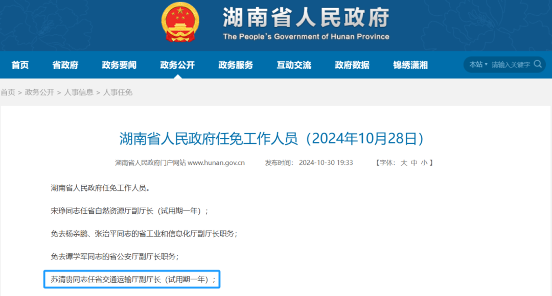 10月30日,湖南省人民政府网站发布任免工作人员信息,任命苏清贵为湖南省交通运输厅副厅长(试用期一年)。苏清贵公开信息显示…