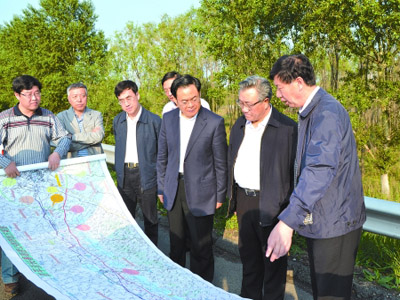 图为李盛霖(右二)在王儒林(右三)等陪同下考察长春绕城高速公路。 聂大兴 摄 5月31日至6月1日,交通运输部部长…