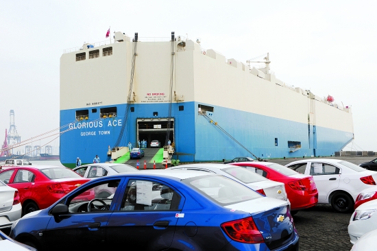 4月24日,英国籍“光荣王牌”滚装汽车船靠泊山东烟台港,装载1974辆烟台产雪佛兰轿车驶往南美(如图)。该船长199.95米,宽…