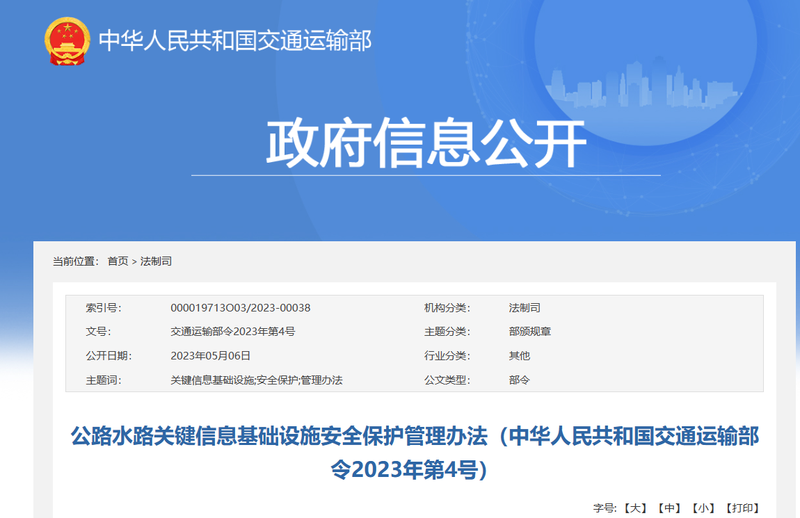 公路水路关键信息基础设施安全保护管理办法(中华人民共和国交通运输部令2023年第4号)