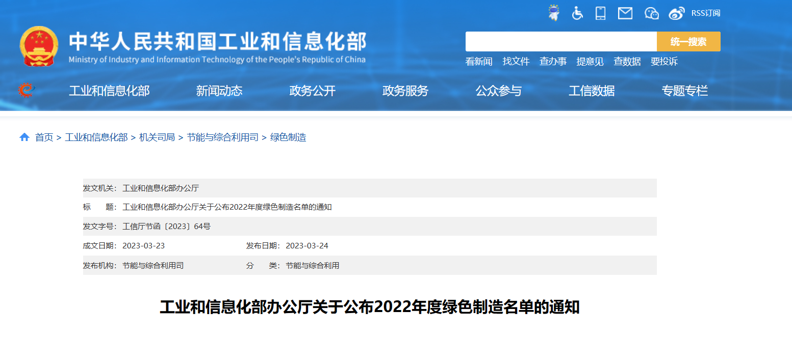 工业和信息化部办公厅关于公布2022年度绿色制造名单的通知