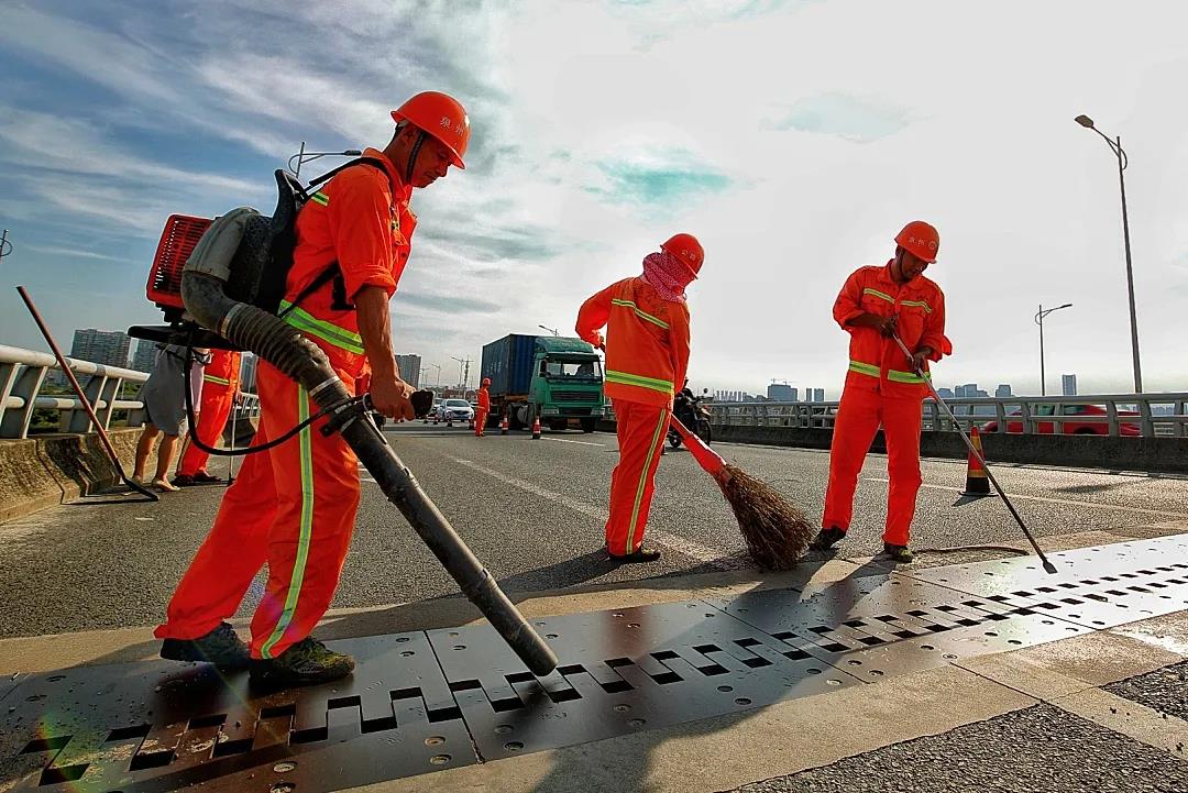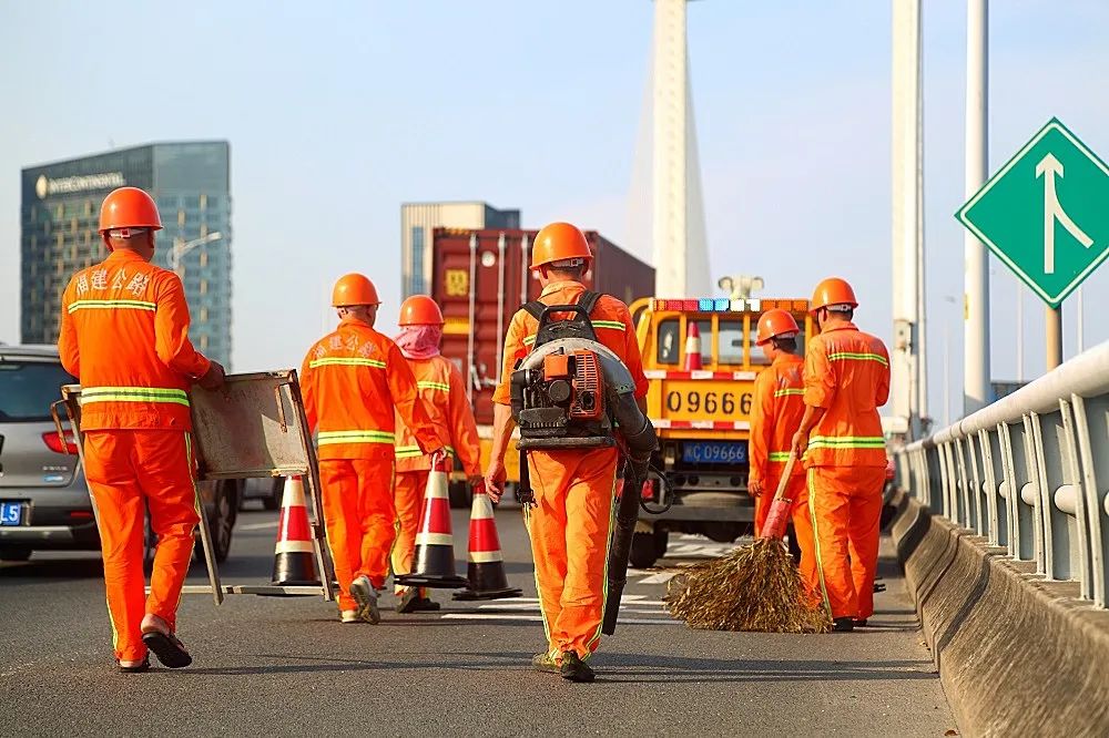 班组成员叶春峰负责放置警示锥筒和警示标志,充当“安全哨”,在烈日下挥舞手臂疏导车流。站里唯一的女职工赖素莲拿着竹扫把清扫作业面,这个竹扫把有两三公斤重,清扫一段桥面至少要挥2000多次。