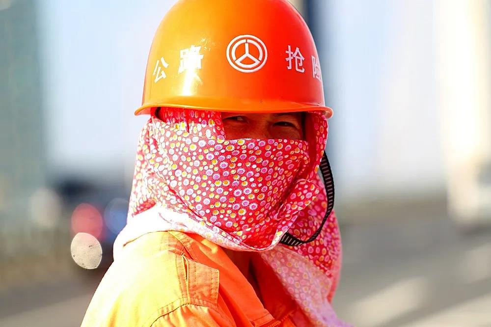 大桥上没有遮挡,阳光直射的桥面热气升腾。测温仪显示,桥面上的气温已超过40摄氏度。养路工黝黑的脸颊上滚落着大颗汗珠,工作服由湿变干、由干变硬,很快渗出盐渍。