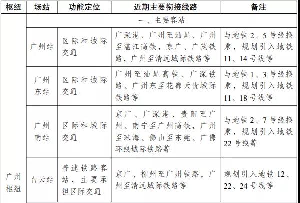 重点枢纽布局和衔接方案提出,粤港澳大湾区城际铁路与高铁、干线铁路通过枢纽换乘实现互联互通,与都市圈市域(郊)铁路、城市轨道交通在枢纽场站换乘衔接。广州枢纽主要场站间通过城际铁路环线和城市轨道交通连通,其余枢纽内各场站间通过城市轨道交通等方式实现连通。