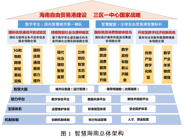 智慧海南总体架构包括“四梁八柱”和“地基”。“四梁”指国际信息通信开放试验区、精细智能社会治理样板区、国际旅游消费智能体验岛、开放型数字经济创新高地四个战略定位;“八柱”包括打造5G和物联网等新型基础设施、提升国际信息通信服务能力、创新现代化治理和智慧监管新模式、构建立体防控智慧生态治理体系、优化国际旅游消费服务智慧化体验、推动数字政府和智能公共服务创新、加快优势产业数字化转型、数字新产业做优做强等内容。“地基”包括智慧大脑、能力中台、支撑体系以及机制体制等共性设施,通过构建智慧大脑和能力中台,形成智慧海南“内核”和技术创新“引擎”,通过健全运营、标准、安全一体化支撑体系,形成多主体高效配合、多要素有力支持的资源中心和生态体系。
