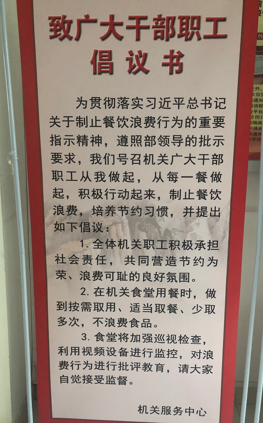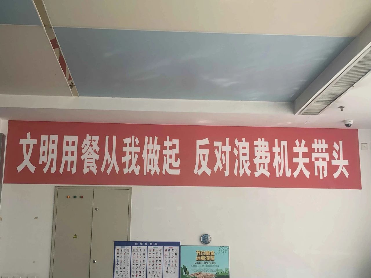 自部机关食堂开放以来,这幅标语一直挂在收餐台处。短短17个字,已深入每一位干部职工心中。