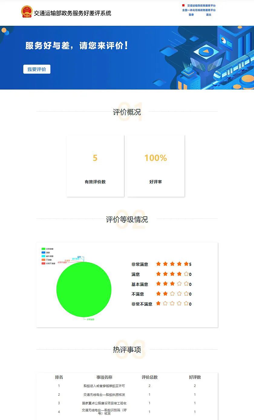 截至发稿时,交通运输部政务服务“好差评”系统收到评价5条,好评率100%。交通运输部将对“好差评”数据开展跟踪分析,研判企业和群众的诉求期盼,持续改进和提升政务服务水平。