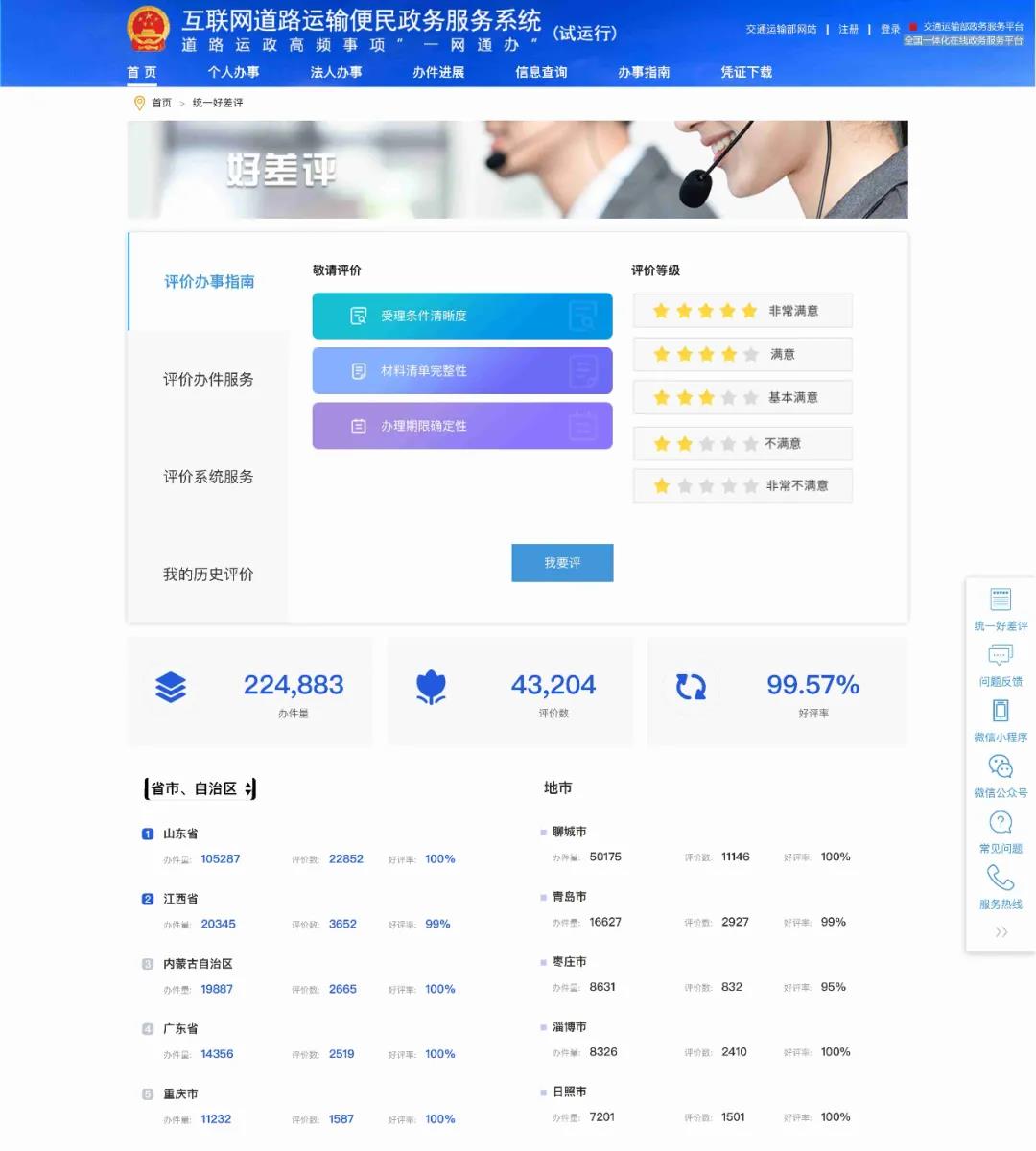 部省协同联动,强化区域协调。为提升企业和群众办事便利度和获得感,对需跨省办理事项和高频异地办理事项,注重发挥跨区域业务协调作用,交通运输部开通了跨省大件运输并联许可系统和互联网道路运输便民政务服务系统,并统一开展“好差评”,相关数据向“好差评”系统归集共享,全面提高大件运输许可、普通货运车辆年度审验等事项服务水平。目前,跨省大件运输并联许可系统注册企业1.5万余家,服务大件运输车辆约7.4万辆。互联网道路运输便民政务服务系统已收到企业和群众对各地交通运输部门评价43204条,好评率99.57%。