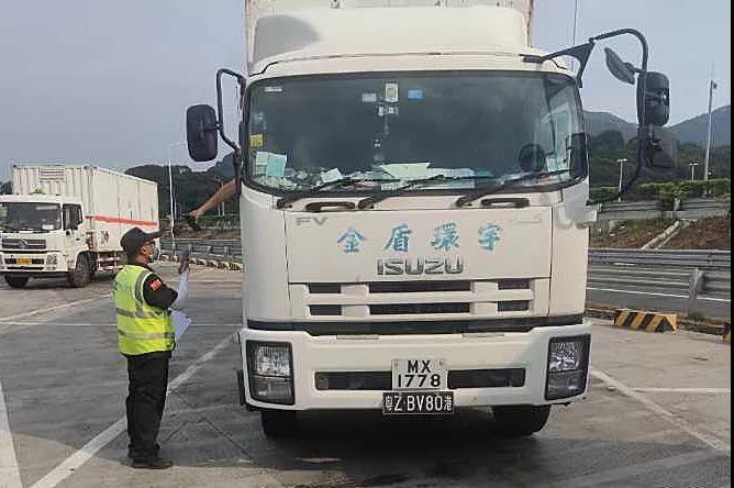 🔺 广州交投集团新安服务区工作人员对香港跨境运输车辆开展信息登记等疫情防控措施。 栗志远 摄