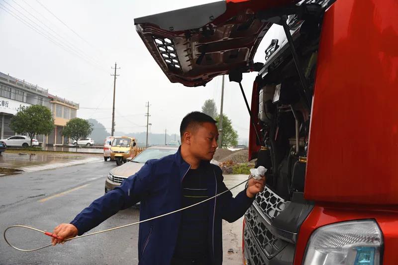 此行,龙兵将与妻子一起到长沙市望城县拉一批饮料,装好货以后送到货主指定地点。因为家门口在修桥,龙兵将货车停放在村子里的一块空地上,需要先开小车到达停放货车的地方。在上车前,龙兵照惯例检查了轮胎、油箱、水箱等,“车子绝不能带病上路,要做到安全有保障。”