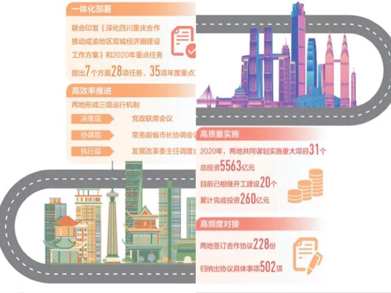 2020年,是双城携手共进、大手笔接连不断的一年:牵手31个重大项目,总投资5563亿元;能源一体化正加速,20个重大项目总投资约9900亿元;双城携手多地共同推进西部陆海新通道设,共建省际协商合作联席会议制度;两省市有关部门、市区(县)签署各类协议228份,多数事项进展良好……交通提速相向而行