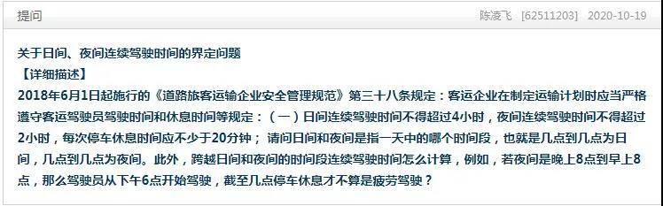 NO.22018年6月1日起施行的《道路旅客运输企业安全管理规范》第三十八条规定:客运企业在制定运输计划时应当严格遵守客运驾驶员驾驶时间和休息时间等规定:(一)日间连续驾驶时间不得超过4小时,夜间连续驾驶时间不得超过2小时,每次停车休息时间应不少于20分钟;请问日间和夜间是指一天中的哪个时间段,也就是几点到几点为日间,几点到几点为夜间。此外,跨越日间和夜间的时间段连续驾驶时间怎么计算,例如,若夜间是晚上8点到早上8点,那么驾驶员从下午6点开始驾驶,截至几点停车休息才不算是疲劳驾驶?