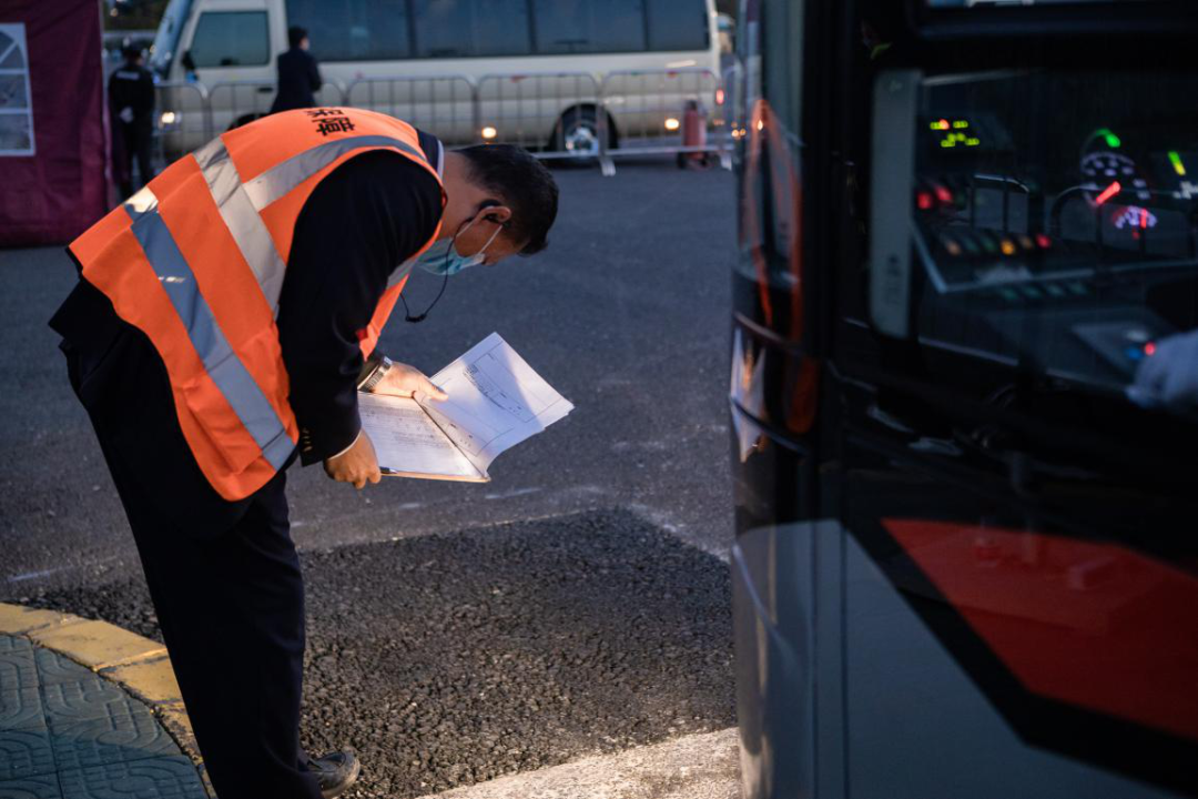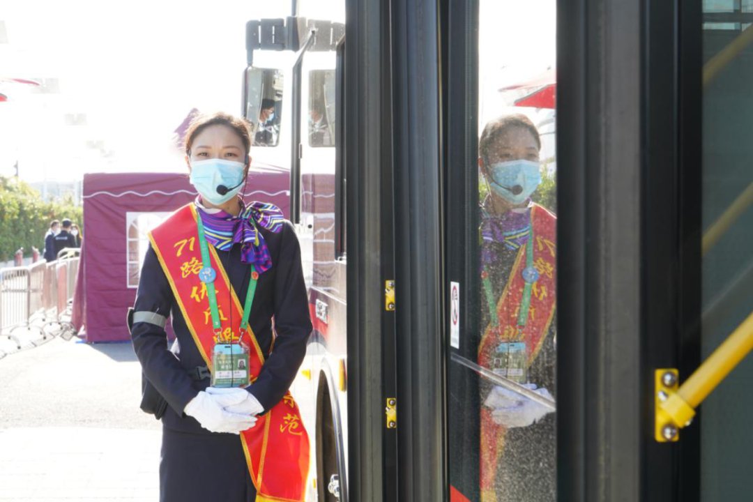 中运量71路公交车特别开行了进博会专线,直达进博会P1停车场。每一趟停靠站点的车辆,在下完客后都要进行消毒,而后再投入运营。