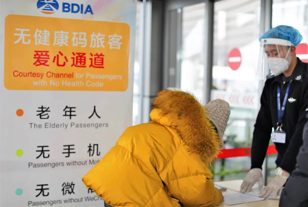 北京大兴国际机场则通过优化测温查码“爱心通道”、建立志愿者帮扶机制的方式,方便老年旅客的正常出行。航站楼全部出入口均设有无健康码“爱心通道”,同时,在部分通道设置“爱心柜台”。除老年旅客外,无电子健康码、无微信、持老年机的旅客也可从“爱心通道”通行,此类旅客通过航站楼入口测温查码通道时,在现场工作人员帮助下登记信息并签署承诺书即可从“爱心通道”快速通行。考虑到外籍老年旅客,大兴机场查验通道还专门增设“北京健康宝”外籍旅客版本标识,如遇健康宝识别、手机操作等问题,现场工作人员将引导外籍老年旅客登记护照信息快速通行。