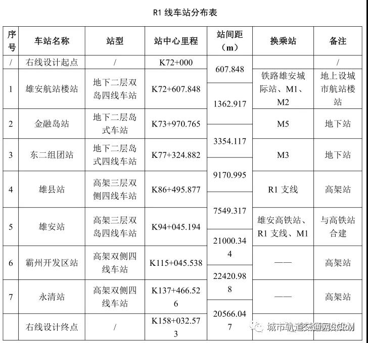 R1线路全长约86公里,其中高架段约65.68公里,其余为地下段。线路设站7座,分别为雄安航站楼站、金融岛站、东二组团站、雄县站、雄安站、霸州经济开发区站、永清站,在大兴机场与北京地铁实现对接。