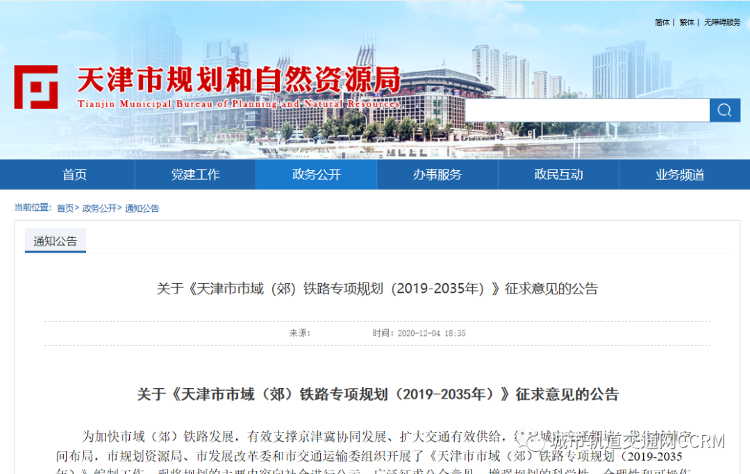 12月4日,天津市市域(郊)铁路专项规划(2019-2035年)在天津市规划和自然资源局网站征求意见。