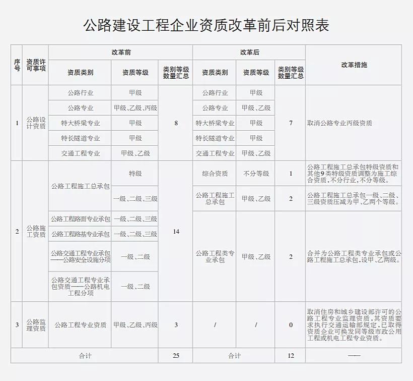《改革方案》直接取消了住房和城乡建设部门许可的公路、水运、水利等专业监理资质,明确上述专业资质执行行业主管部门规定;已取得住房和城乡建设部门许可的公路工程专业监理资质的,可换发同等级市政公用工程或机电工程专项资质。改革后,解决了重复审批问题,由交通运输部对公路工程监理企业资质进行统筹管理,是建设高效规范的公路监理市场的充分体现,对于公路监理企业是一个极大的利好,真正让公路监理企业享受到改革的成果。