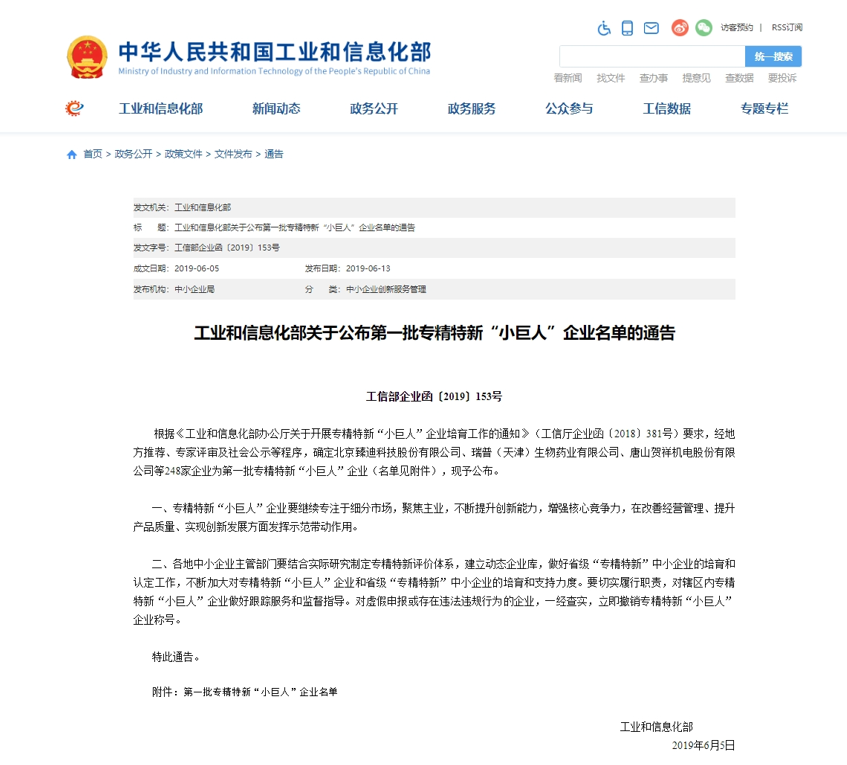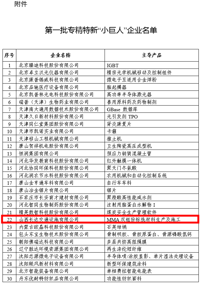 2019年6月13日,国家工业和信息化部发布首批专精特新“小巨人”企业名单,山西长达交通设施有限公司入选这一名单,荣获国家级专精特新“小巨人”称号。