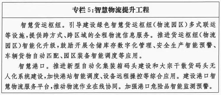 推进物流枢纽智能化升级。推进智能仓储配送设施建设,推广仓储数字管理、安全生产预警、车辆货物自动匹配、园区智能调度等应用。推动物流园区间信息共享和业务协作。