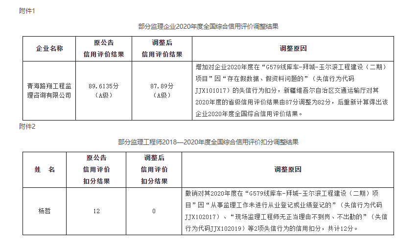 关于部分公路监理企业2020年度全国综合信用评价和部分监理工程师2018—2020年度全国综合信用评价扣分调整结果的公示