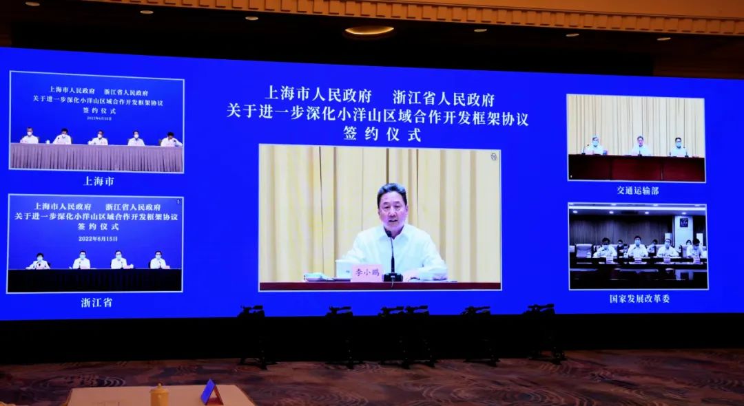 昨天下午(6月15日),上海市人民政府与浙江省人民政府以视频连线方式正式签署进一步深化小洋山区域合作开发框架协议。上海市委书记李强、浙江省委书记袁家军和交通运输部部长李小鹏、国家发展改革委副主任胡祖才出席签约活动并讲话。上海市委副书记、市长龚正,浙江省委副书记、省长王浩共同签署协议。