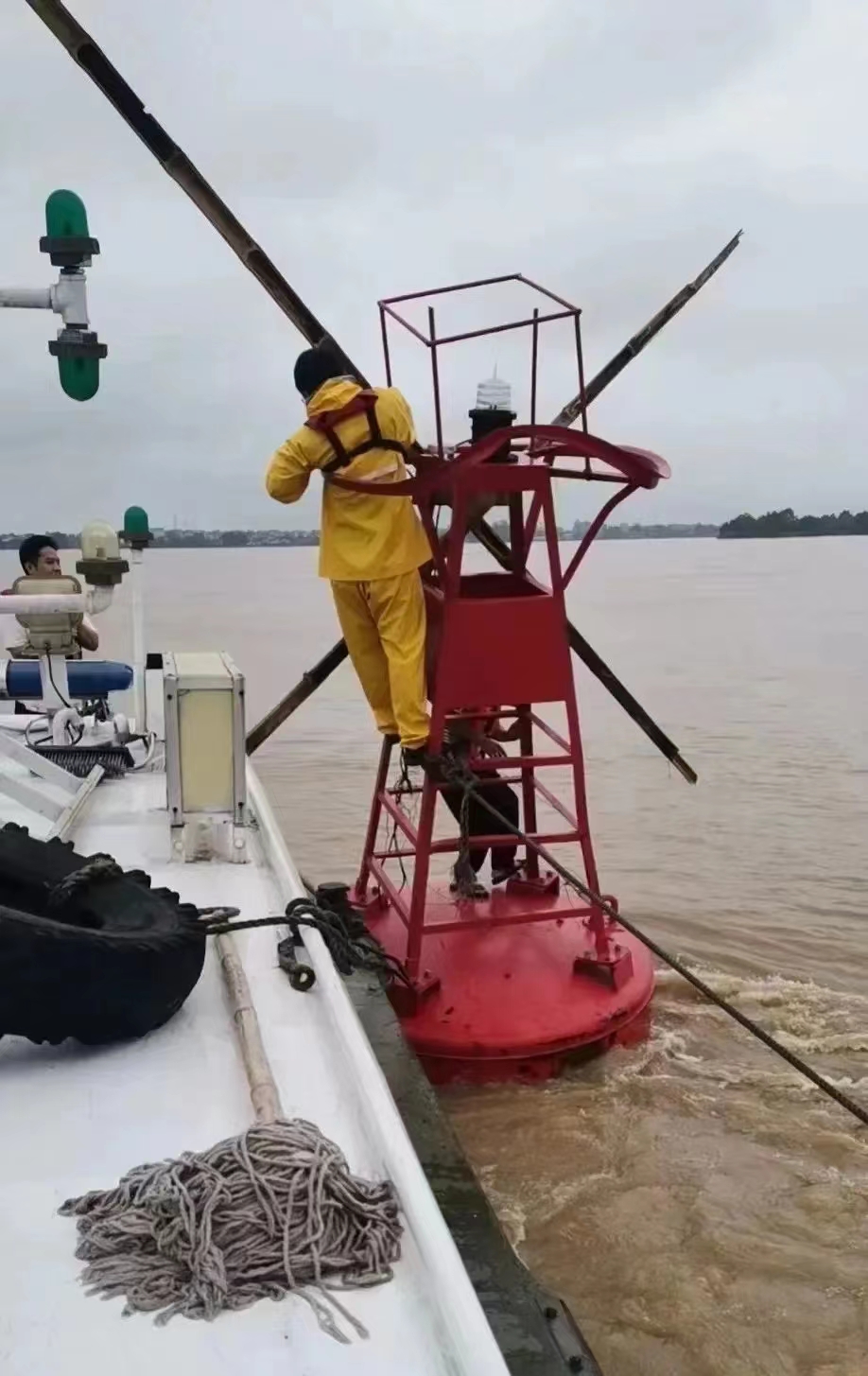 广西平南航道站工作人员执行封闭浮鼓标志任务,在辖区开展汛期巡航任务,维护航标灯艇安全归位。