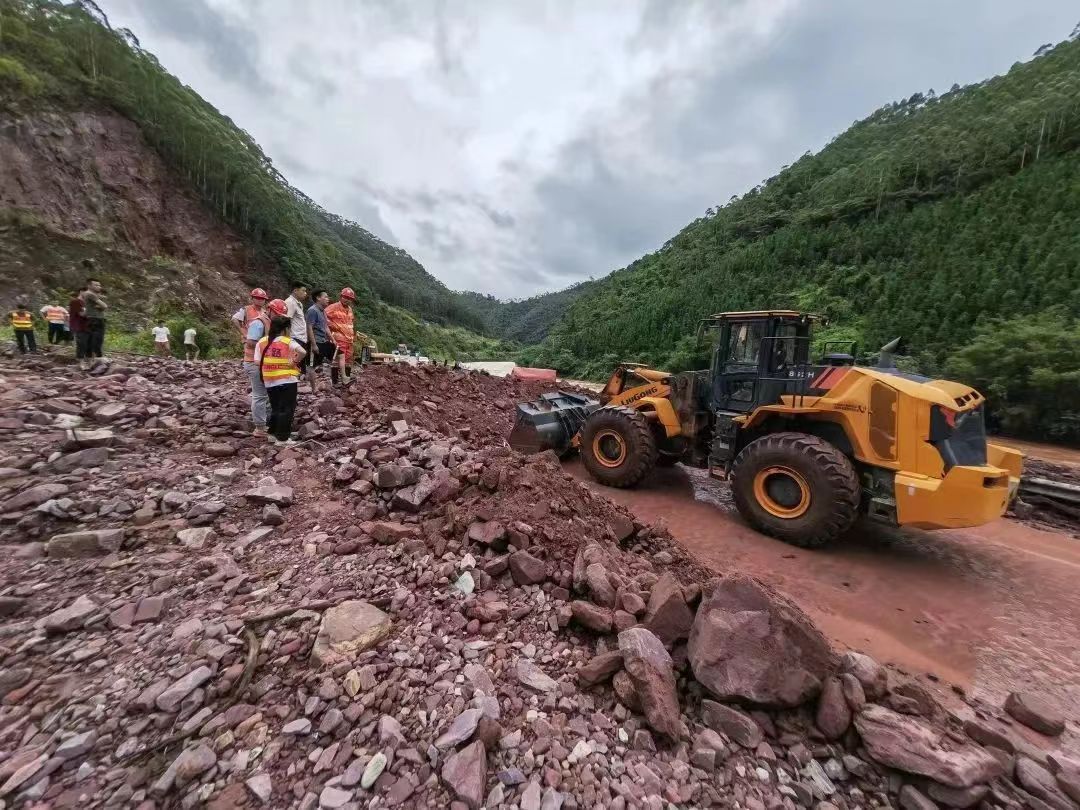 龙岩市长汀县境内部分路段交通中断,长汀公路部门迅速集结抢险队员、铲车、挖掘机、龙马车赶赴现场抢险保通。