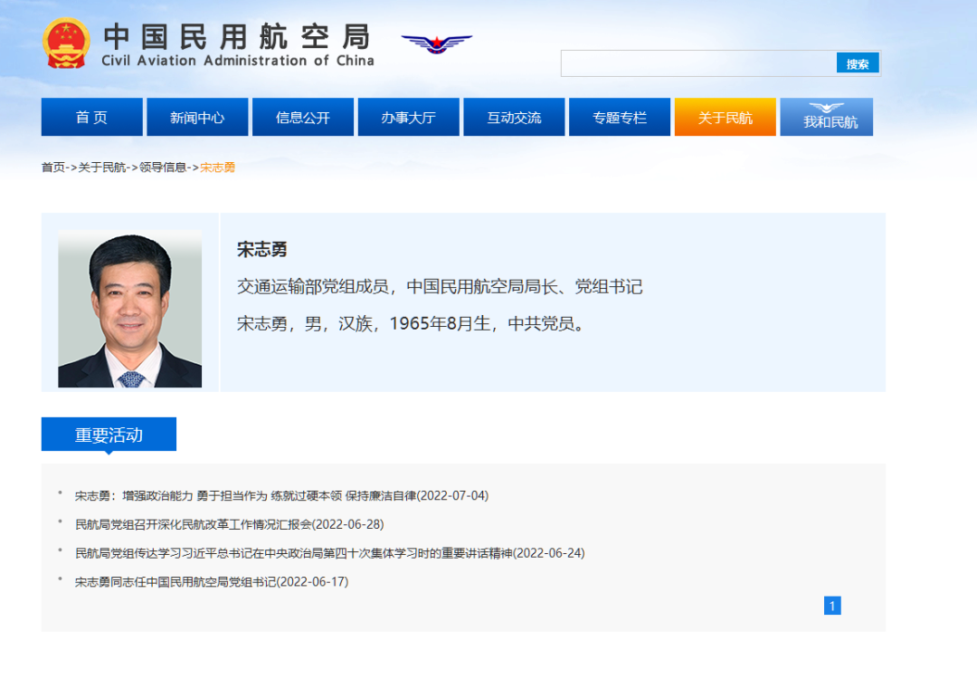 据中国民用航空局官网“领导信息”栏显示,宋志勇为交通运输部党组成员,中国民用航空局局长、党组书记。