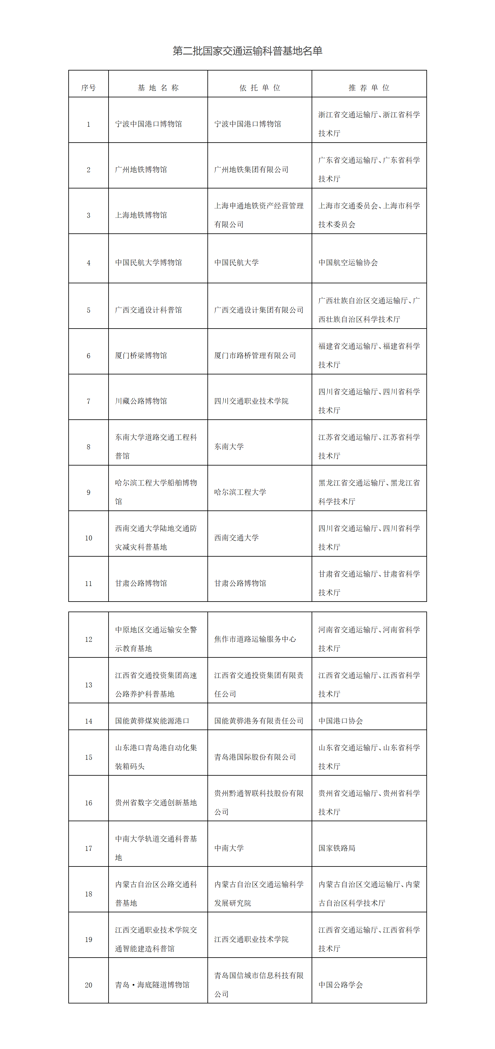 根据《国家交通运输科普基地管理办法》(交科技发〔2020〕73号,以下简称《管理办法》),经各地各部门推荐、专家评审及公示、交通运输部和科学技术部审定,现公布第二批国家交通运输科普基地名单(见附件)。