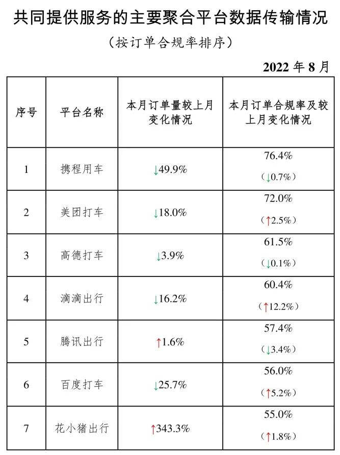 其中,面向乘客、与网约车平台公司共同提供服务的平台(俗称“聚合平台”)完成1.67亿单,按订单合规率由高到低的分别是携程用车、美团打车、高德打车、滴滴出行、腾讯出行、百度打车、花小猪出行。