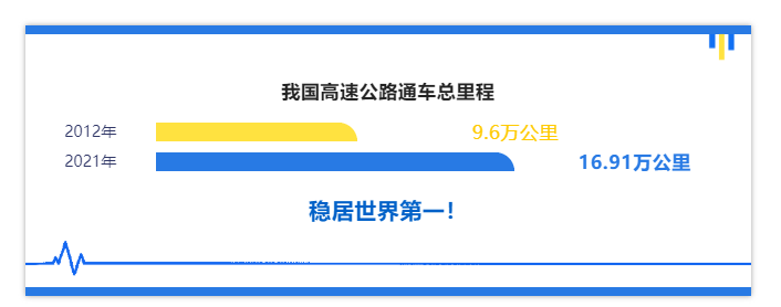这是规模庞大、速度惊人的精彩跃升——2012年年底,我国高速公路通车总里程达9.6万公里,首次超越美国跃居世界第一。到2021年年底,这个数据已刷新为16.91万公里,继续稳居世界第一,向更深更密处增长。