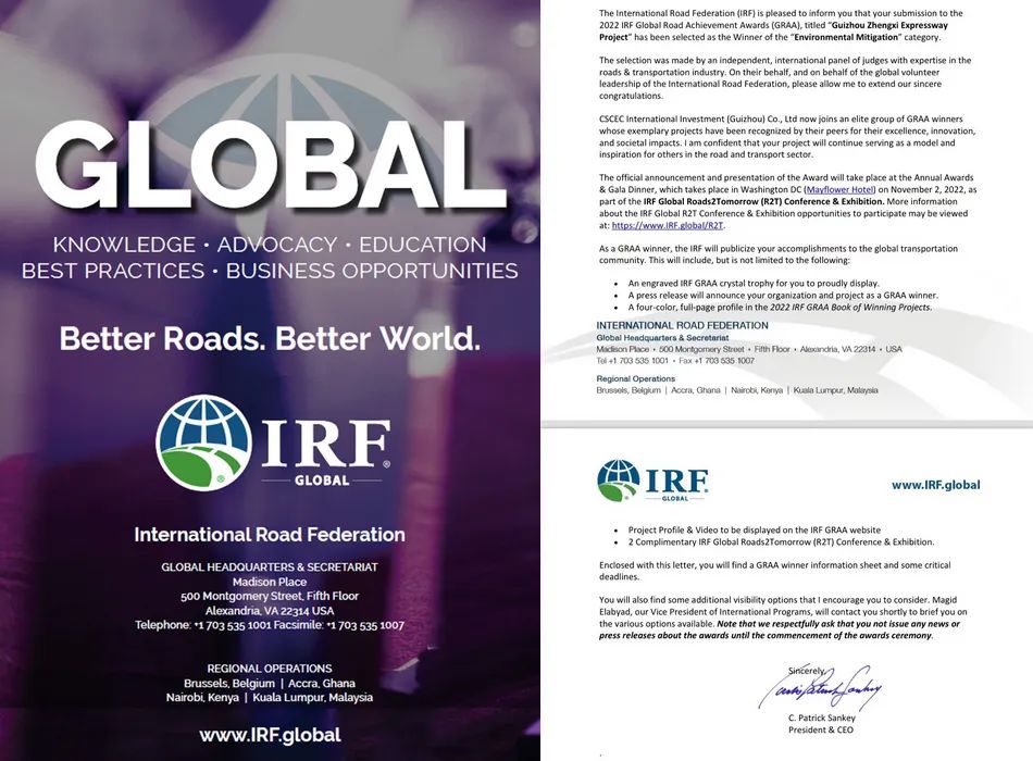 11月3日,“贵州省德江至习水高速公路(正安至习水段)PPP项目(以下简称‘正习高速’)荣获2022年全球道路联合会(IRF Global)唯一全球道路成就奖(GRAA)环境保护类奖!”此前,该项目还曾斩获英国土木工程师学会NCE国际隧道工程大奖,并作为2022年度中国唯一入选联合国2030年可持续发展议程示范项目。