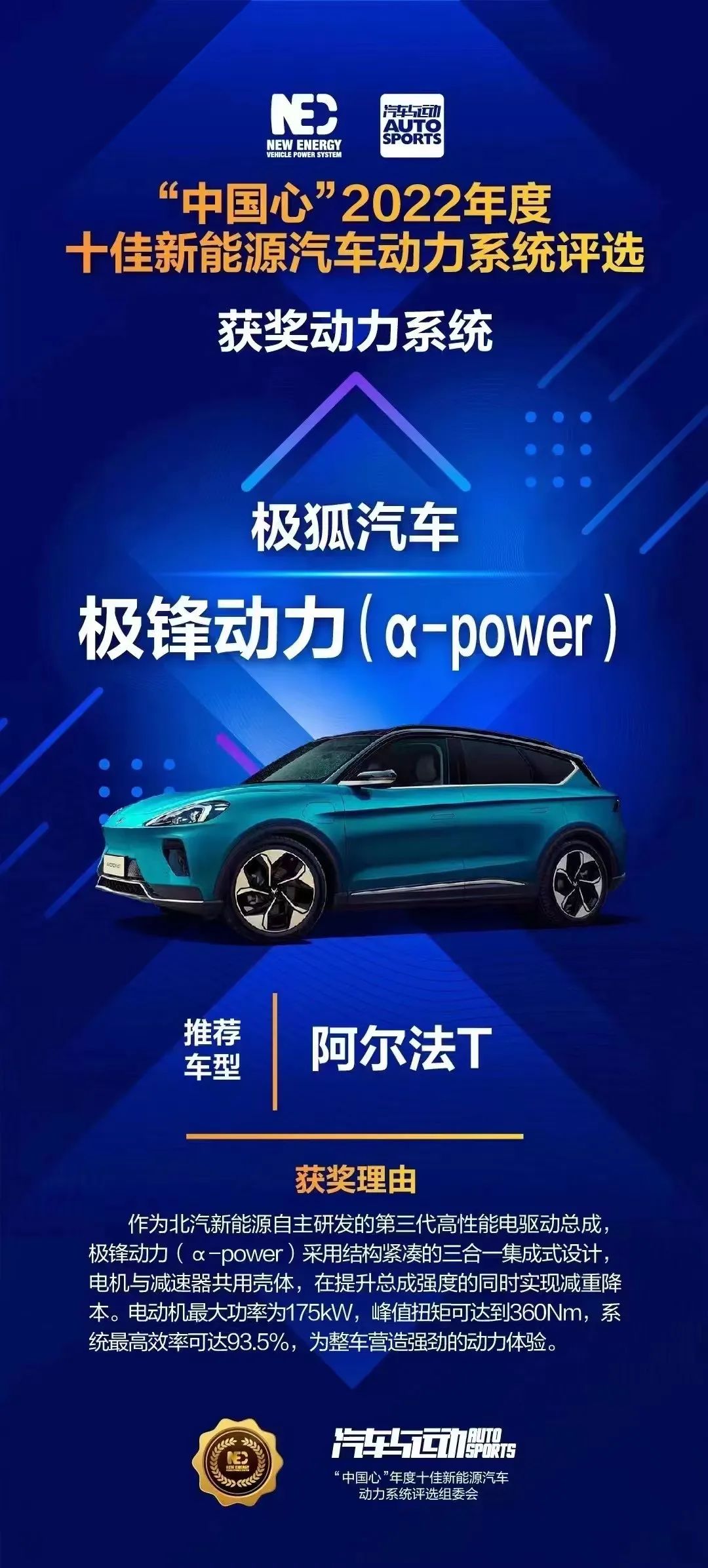 热烈祝贺GIT分会副会长单位北汽新能源极狐阿尔法T的极锋动力(α-power)荣获“中国心”十佳新能源汽车动力系统大奖