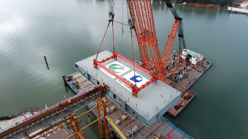 为确保首片钢箱梁安全顺利架设,广州交投集团、保利长大精心部署、提前谋划,通过三维BIM模型精确分析梁体重心位置,并配合设计专用吊具,同步优化吊装工艺;组织专家研讨,提前演练和完善浮吊、拖轮及锚艇协同机制;成立安全生产领导小组、应急指挥领导小组,对参与桥梁施工的技术人员和施工人员开展安全技术交底,确保钢梁架设作业全过程安全可控。