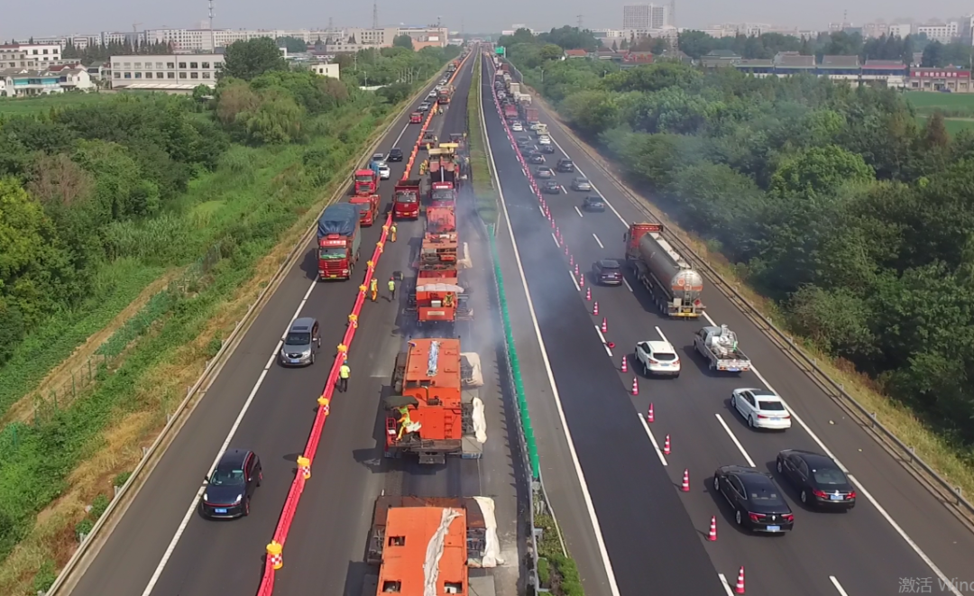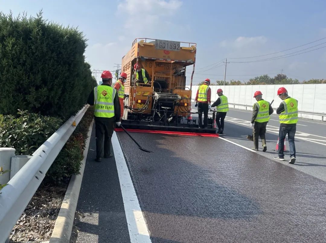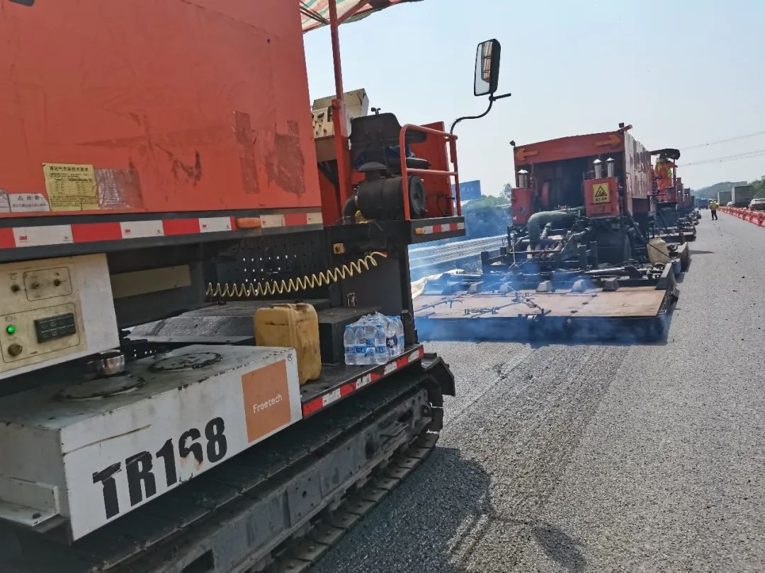 注重四新应用,集约养护添助力。为深入践行“苏式养护”品牌内涵,泰州大桥在本次集约化养护中创新性应用了就地热再生和超薄抗滑磨耗层技术。就地热再生施工相比于传统的铣刨重铺,能够充分利用原有路面材料,对沥青混凝土的使用压降至原来的15%,减少了对沥青、石料等不可再生资源的浪费,以实际行动贯彻绿色发展要求;超薄抗滑磨耗层施工技术具有抗滑、耐磨、封水、降噪等特点,能够延长路面使用寿命、纠正表面缺陷。与传统摊铺工艺相比,还能够实现粘层油撒布与沥青摊铺一体化施工,避免了机械设备对粘层造成破坏和二次污染,不仅能精准控制超薄层厚度,还能提升整体施工品质,施工作业效率大大提高。