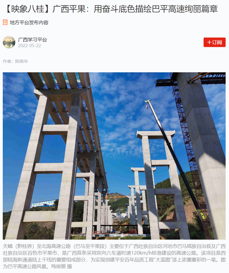 其中,《用奋斗底色描绘巴平高速绚丽篇章》图文报道登上学习强国;中国交通报以题为《造匠心精品 助壮乡腾飞——巴平高速创建“平安百年品质工程”纪实》的文章报道巴平高速平安百年品质工程创建成果;广西日报以题为《党旗领航风帆劲 砥砺奋进创佳绩——新发展集团巴平高速指挥部推动基层党建工作高质量发展》专版刊发指挥部党建工作高质量发展成果,对外展现项目“好”“快”建设成果,提升集团公司形象和影响力。今年11月,巴平高速入选40强全国公路重大工程新闻宣传优秀项目。