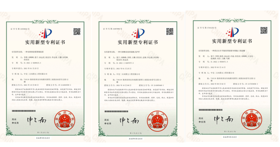 勇于创新 技术攻关 项目团队深入开展技术创新、工艺创新、材料创新、设备创新,取得累累硕果。截止目前,项目已累计获得“一种双壁钢套箱围堰装置”、“一种可调整高度的装配式护栏”、“一种防侧翻提渣桶”、“一种抱箍式连接装置”、“一种悬索桥锚固系统预埋管测量定位的调校装置”、“一种清洁安全节能的预制梁冬期施工保温棚”、“一种悬索桥锚固系统预埋管辅助测量装置”等7项实用新型专利的授权。