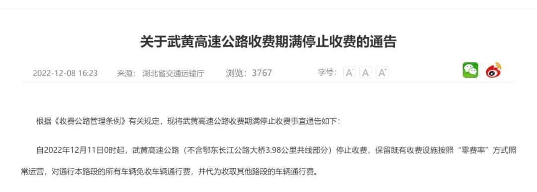 12月8日,湖北省交通运输厅网站发布《关于武黄高速公路收费期满停止收费的通告》(以下简称《通告》)。