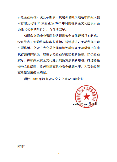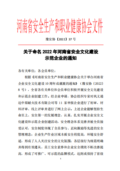 发布《关于命名 2022年河南省安全文化建设示范企业的通知》