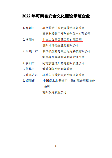 热烈祝贺我会绿色智慧交通分会副会长单位中交二公局四公司荣获“2022 年河南省安全文化建设示范企业”荣誉称号