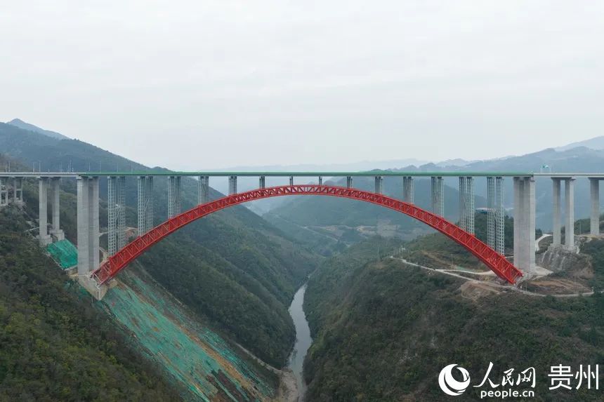 贵州桥梁集团仁遵高速第五合同段项目经理任达勇说:“大发渠特大桥因地势险峻,缆索吊装系统首次采用单塔形式,大桥56个拱肋中最大节段重240吨。项目技术团队在传统缆索吊装施工方法上开展技术攻关,通过自主设计的大吨位无塔缆索横移装置,顺利解决了山区特殊地形地貌大跨度大吨位缆索吊装施工”。
