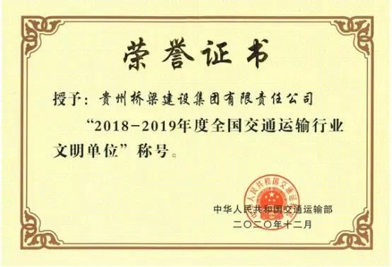 贵州桥梁始终以一座座精品工程树立企业品牌,以先进文化涵养企业品牌,先后荣膺“全国先进基层党组织”、国家科技进步奖、“全国五一劳动奖状”、第二届“贵州省省长质量奖”“全国建筑业先进企业”“全国模范职工之家”“全国工程建设质量管理优秀企业”“全国交通企业文化建设优秀单位”等荣誉,连续多年上榜“贵州20强企业”。以信用体系建设筑牢公司发展之基,被中国建筑业协会评为“全国建筑业AAA级信用企业”,是贵州省“信贷诚信企业”,连续29年获得“守合同重信用企业”荣誉称号。