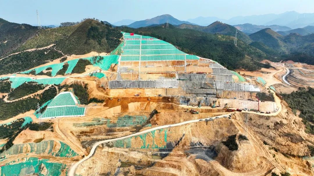 平陆运河全线最高边坡——开挖高度最高188米的马道枢纽2号边坡施工现场。