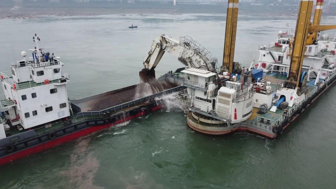 朝涪段项目大型铲斗挖泥船“长鹰8”在长江上游进行疏浚作业。
