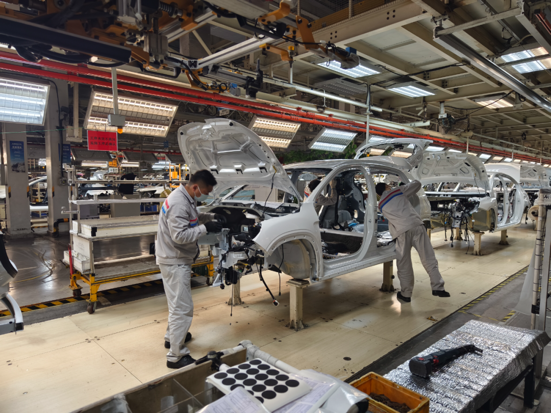 4月7日,安徽合肥新桥智能电动汽车产业园蔚来第二制造工厂生产线。新华社记者吴慧珺 摄